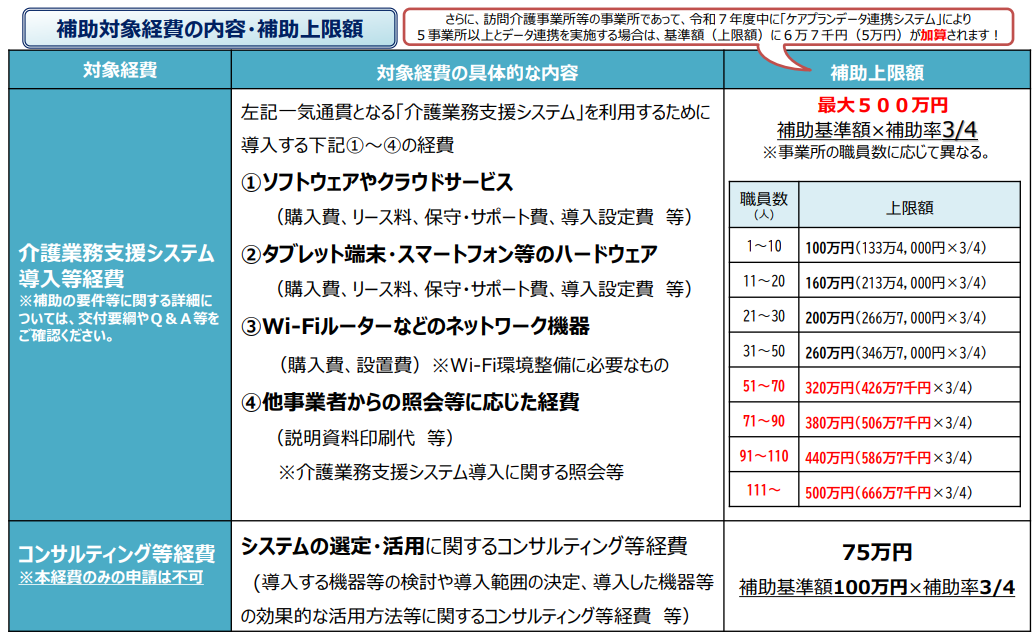 介護事業所が、デジタル機器を活用し介護業務の負担軽減に資する機能を有したシステム(以下「介護業務支援システム」という。)を導入する場合に、必要な経費の一部を補助します。