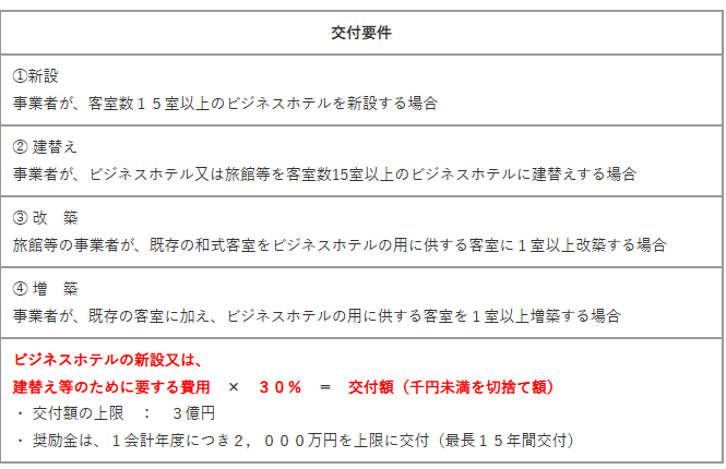 観光やビジネスで訪れる方々の宿泊需要に対応するため、ビジネスホテル新設や既存宿泊施設からの建替えを支援します。