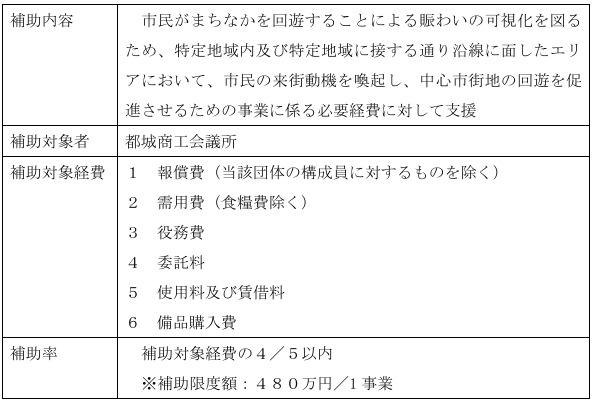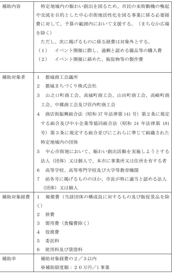 中心市街地の中核施設「Mallmall」周辺エリアや都城駅周辺といったまちなかを対象に、賑わい創出に繋がる様々なイベント等の活動を実施する市民、商工団体等に対して予算の範囲内において補助金を交付し、支援することで中心市街地の活性化を図ります。