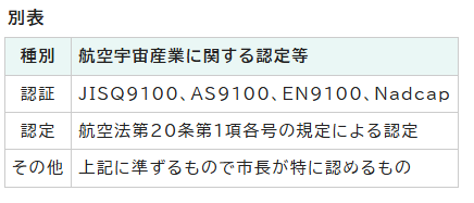 - 下記別表に掲げる航空宇宙産業に関する認証等(認定にあっては、補助対象事業を行う事業所に対するものに限る。)を受けていること